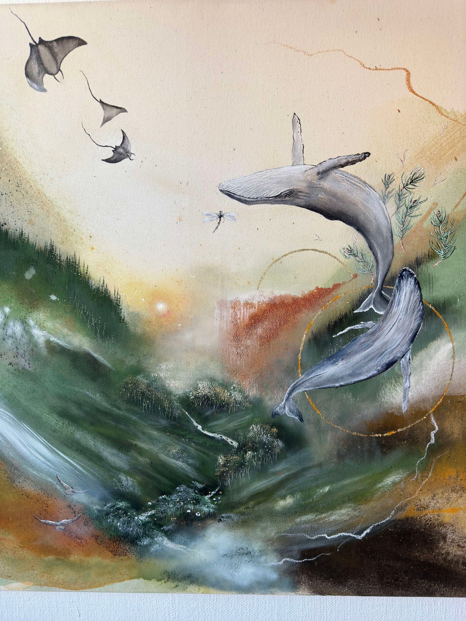 70x50 cm på linneduk. Målad med akrylfärg, jordpigment och detaljer med oljepasteller, guldpulver och kol.