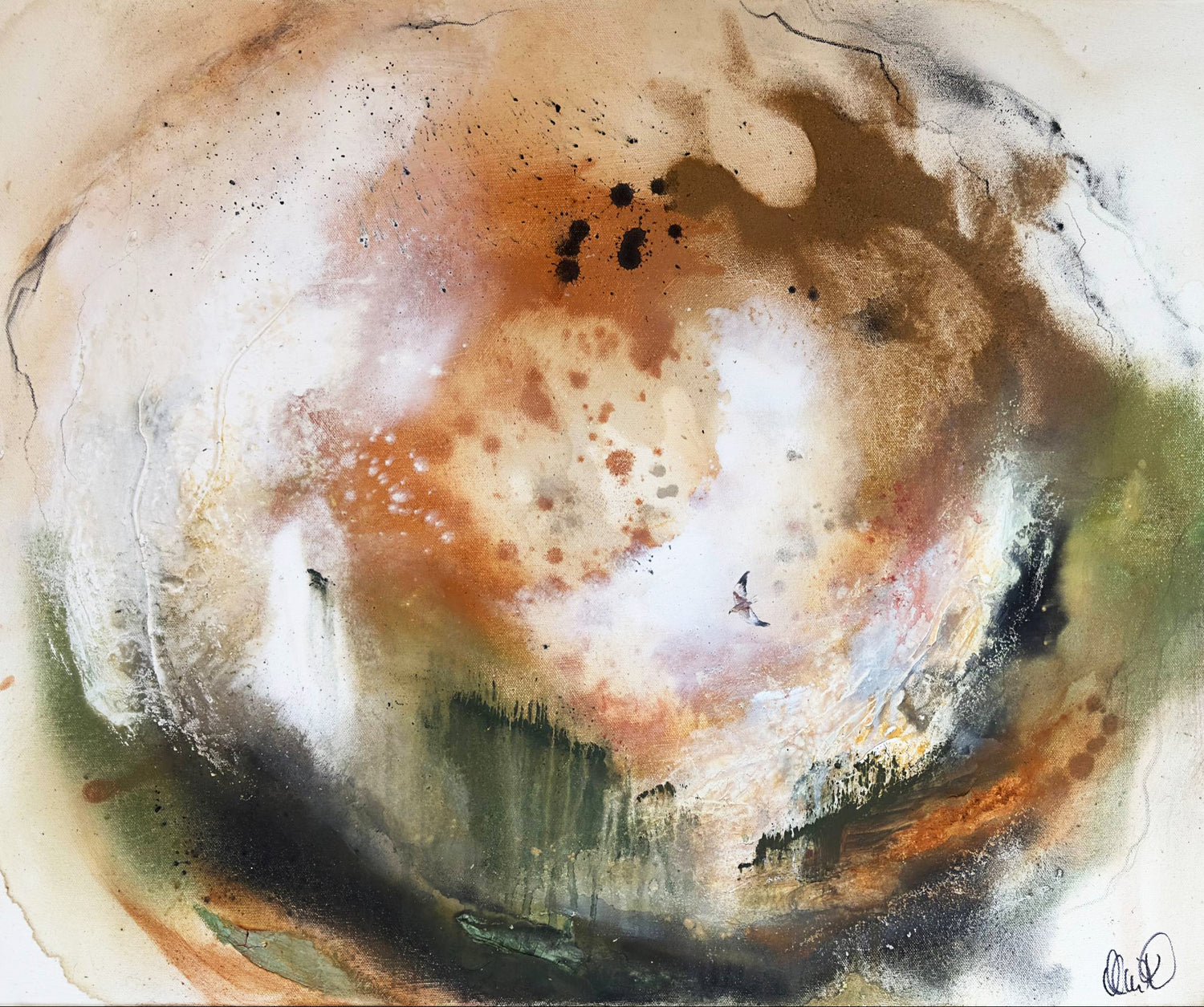 100x80 cm på linneduk. Målad med akrylfärg, jordpigment och detaljer med oljepasteller, guldpulver och kol.