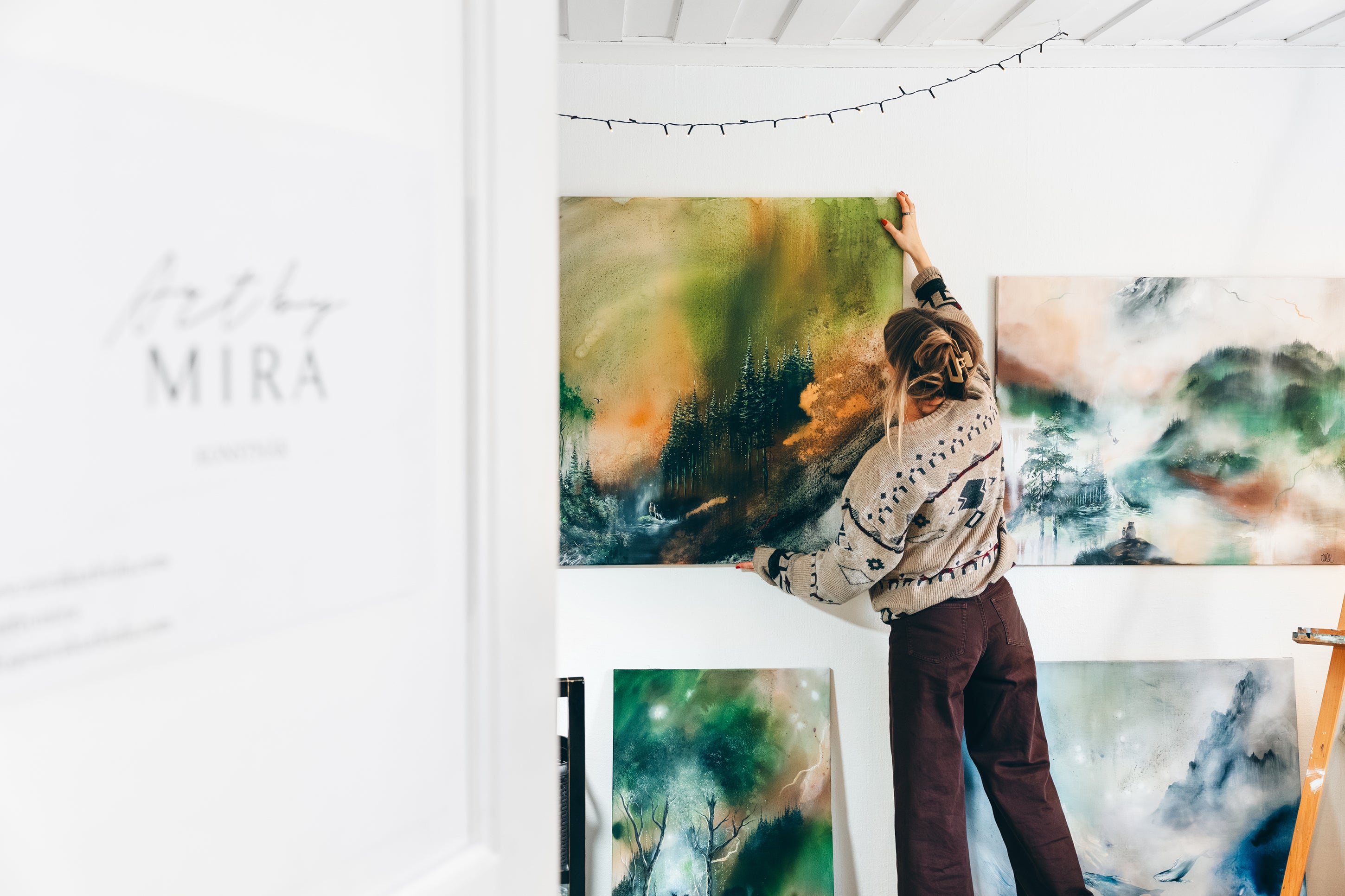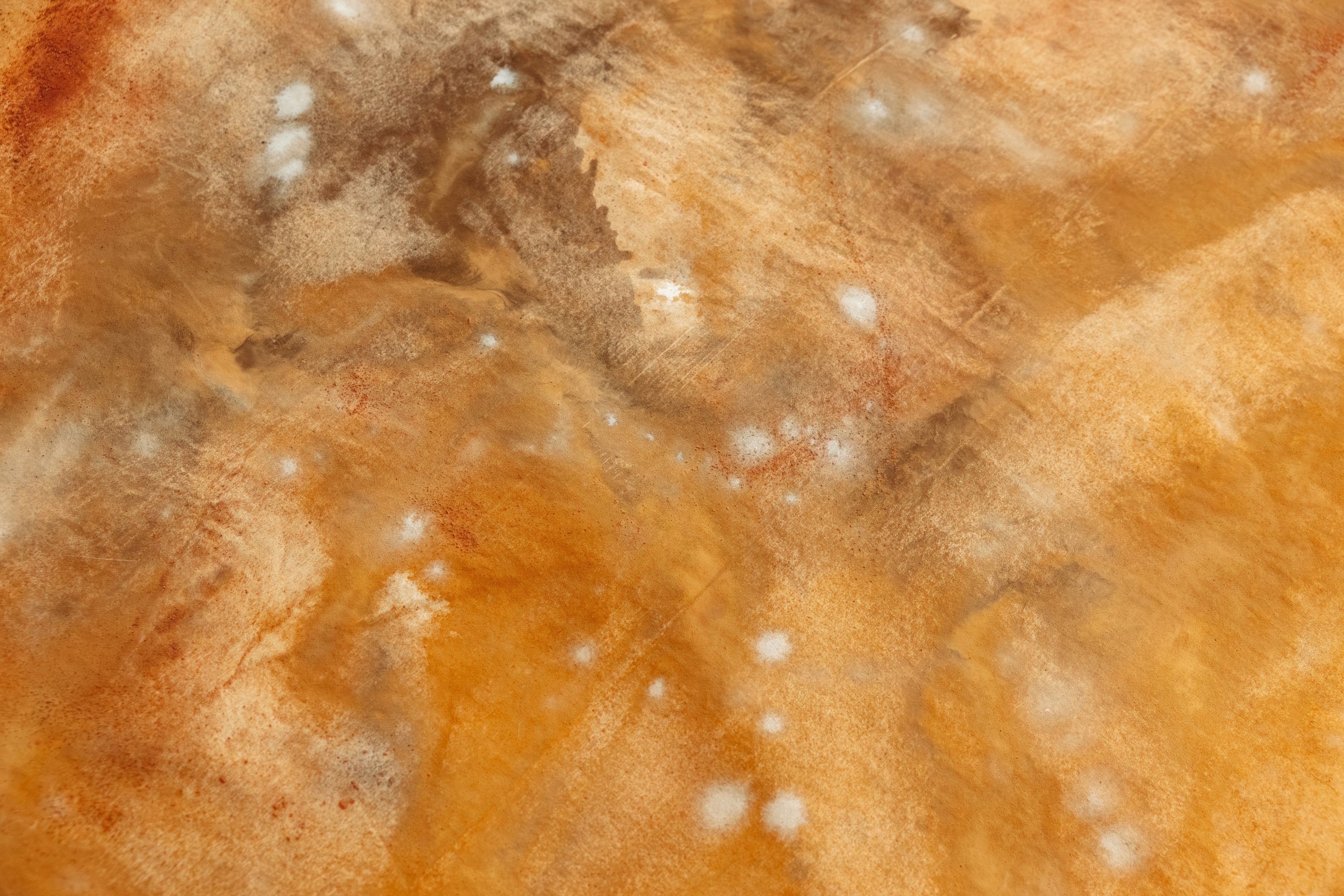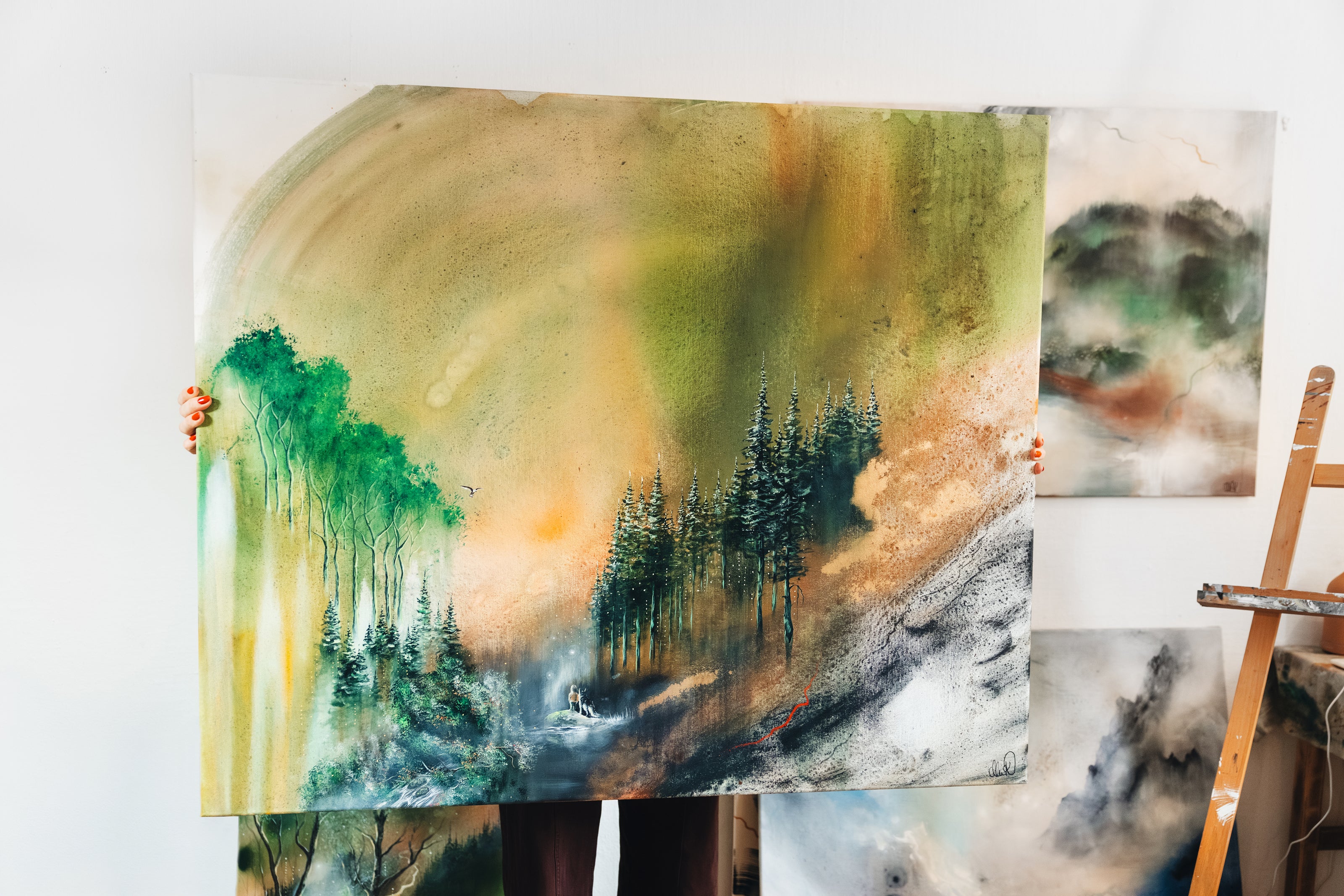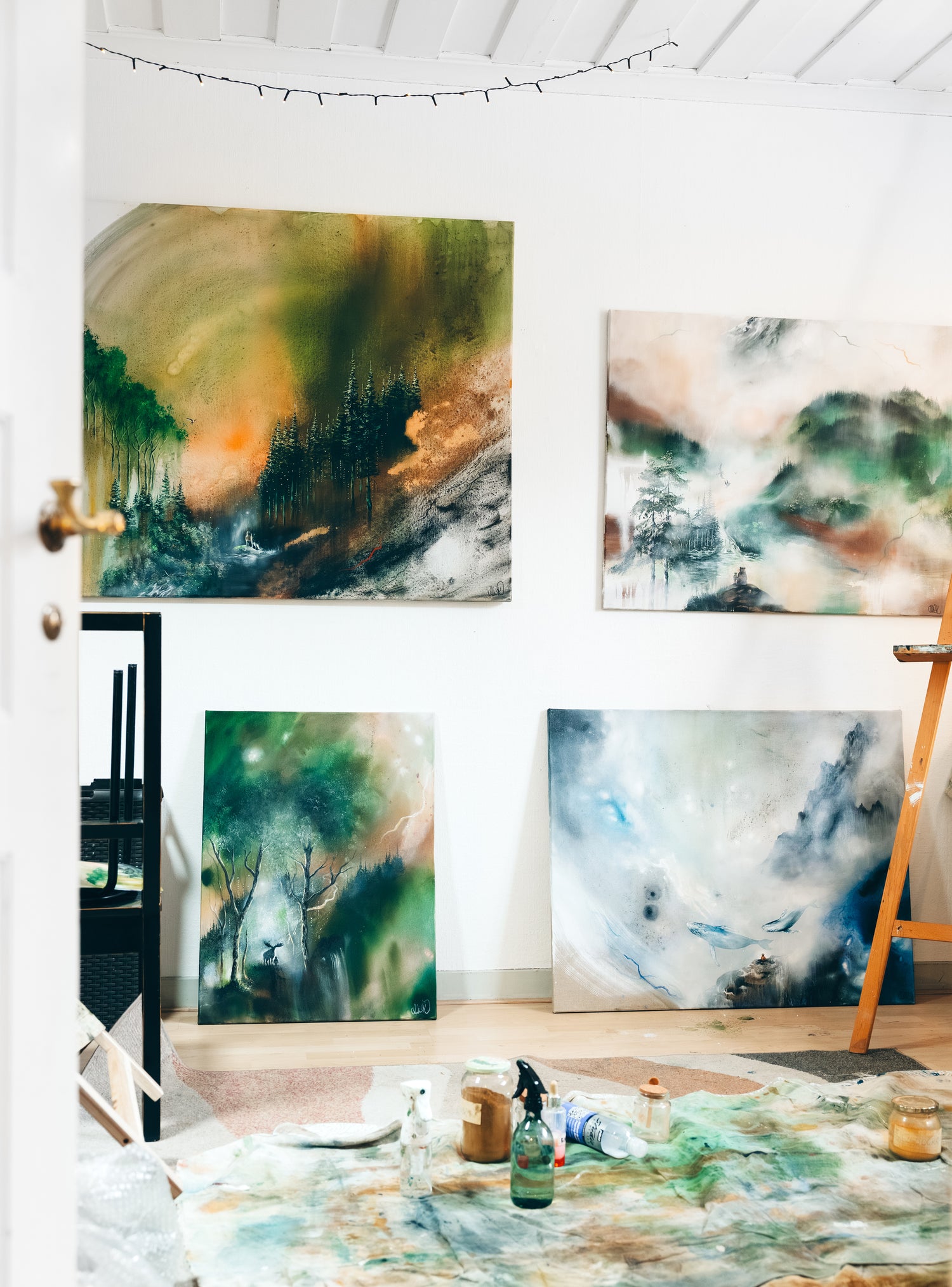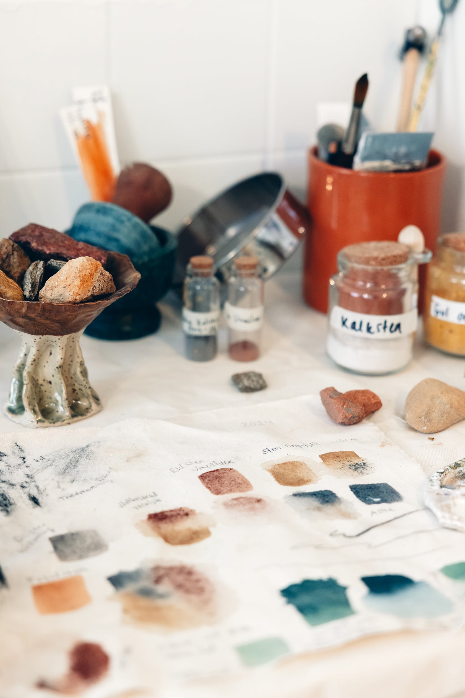 I mina målningar arbetar jag med jordpigment, akrylfärg, aska, kol och oljepasteller. Jordpigmenten samlar jag själv från stenar och jord runt Umeå, men också från andra platser vid fjälltrakter och kustlandskap.
