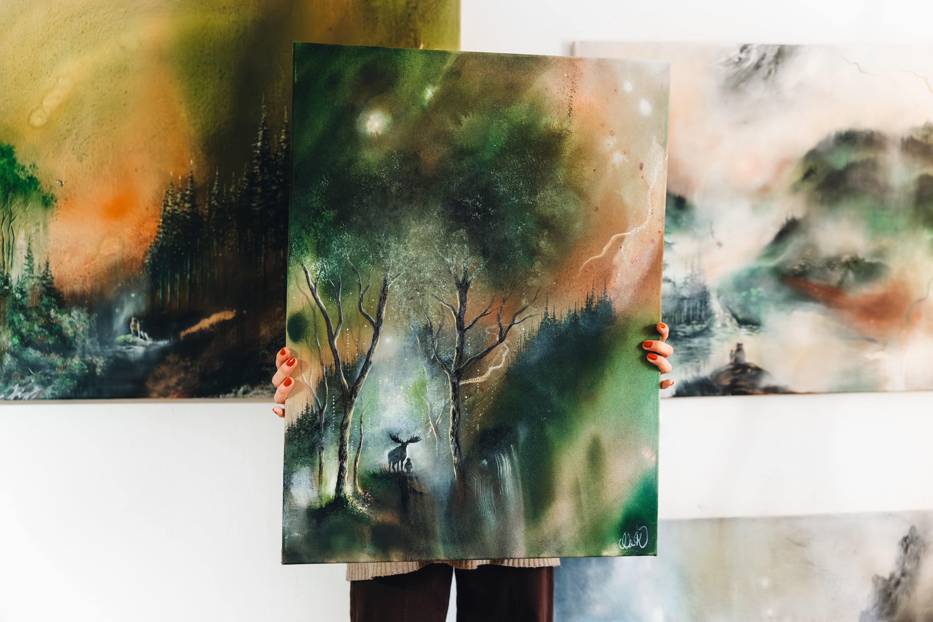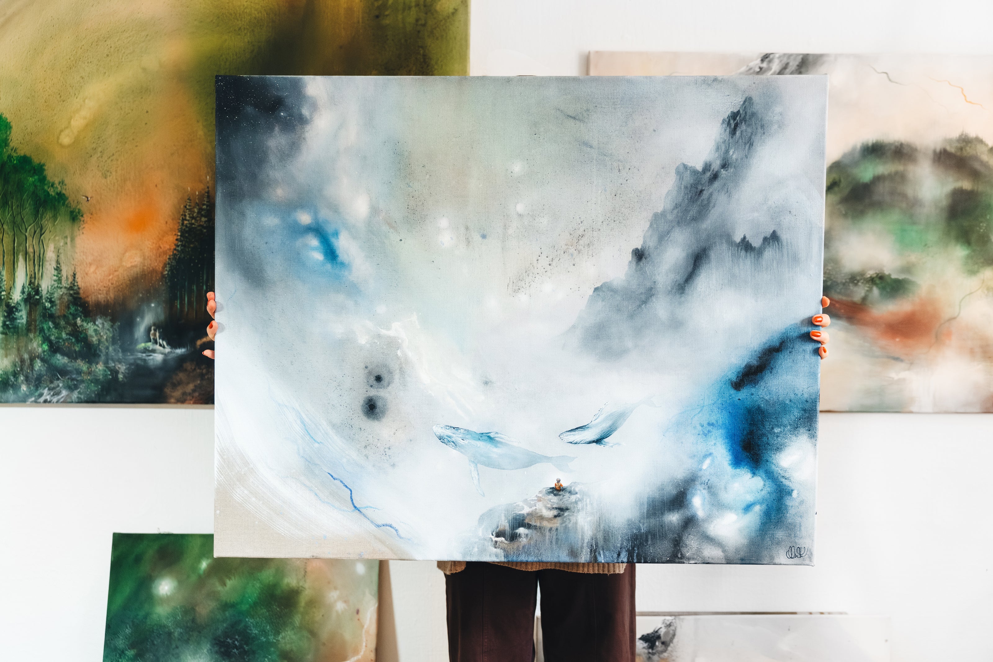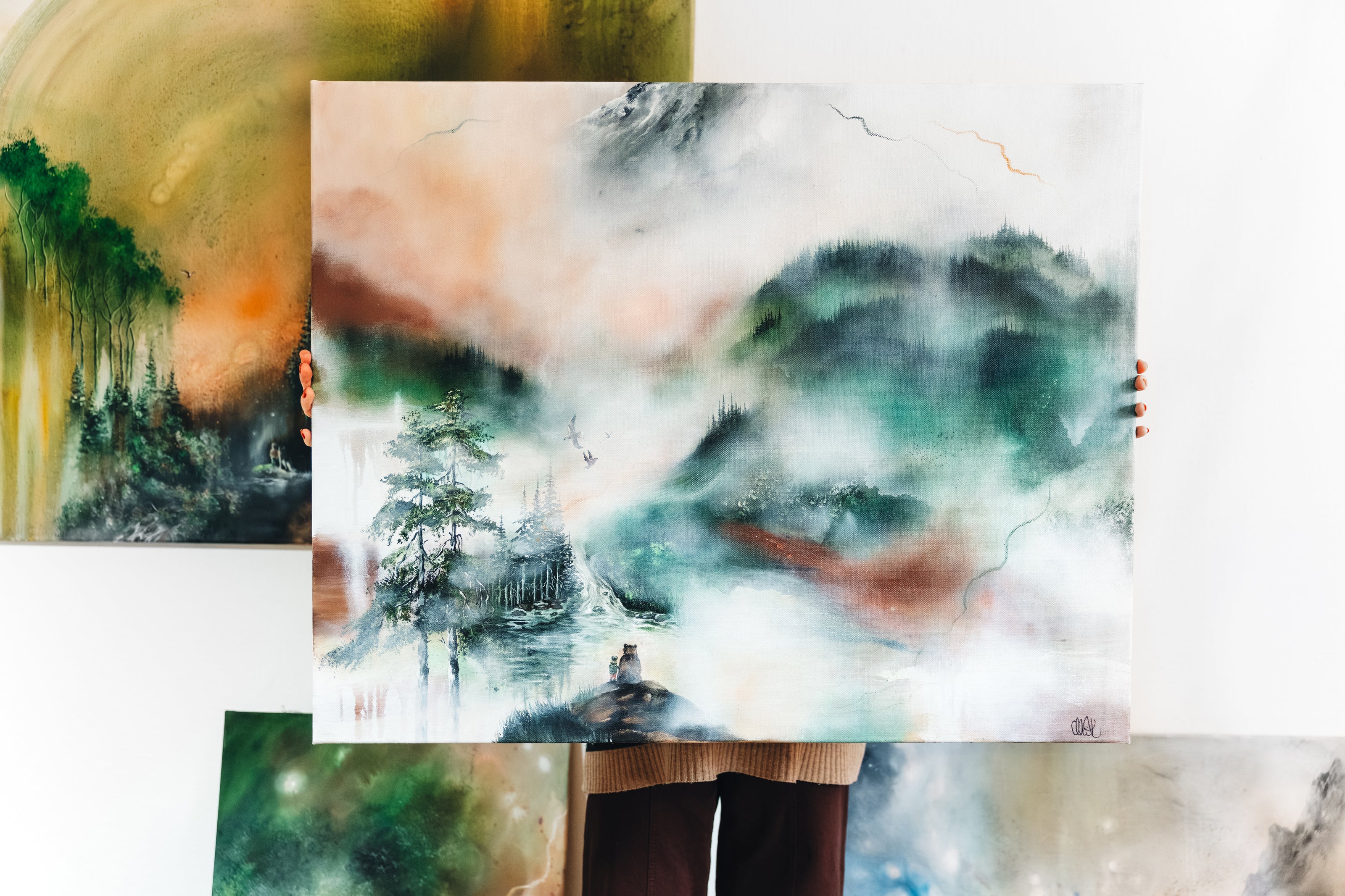 Sammanvävda landskap består av fyra målningar med tillhörande konsttryck där ett barn möter ett specifikt djur i ett större landskap. Motiven rör sig mellan det föreställande och det mer abstrakta i drömlika naturmiljöer.