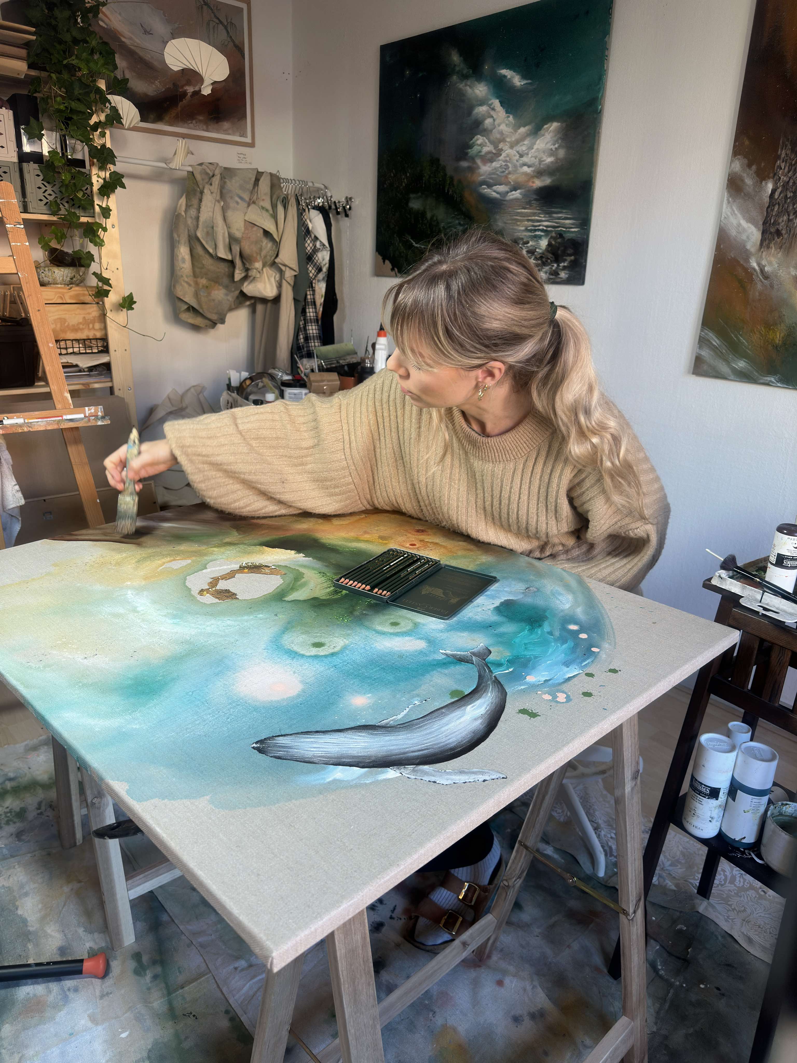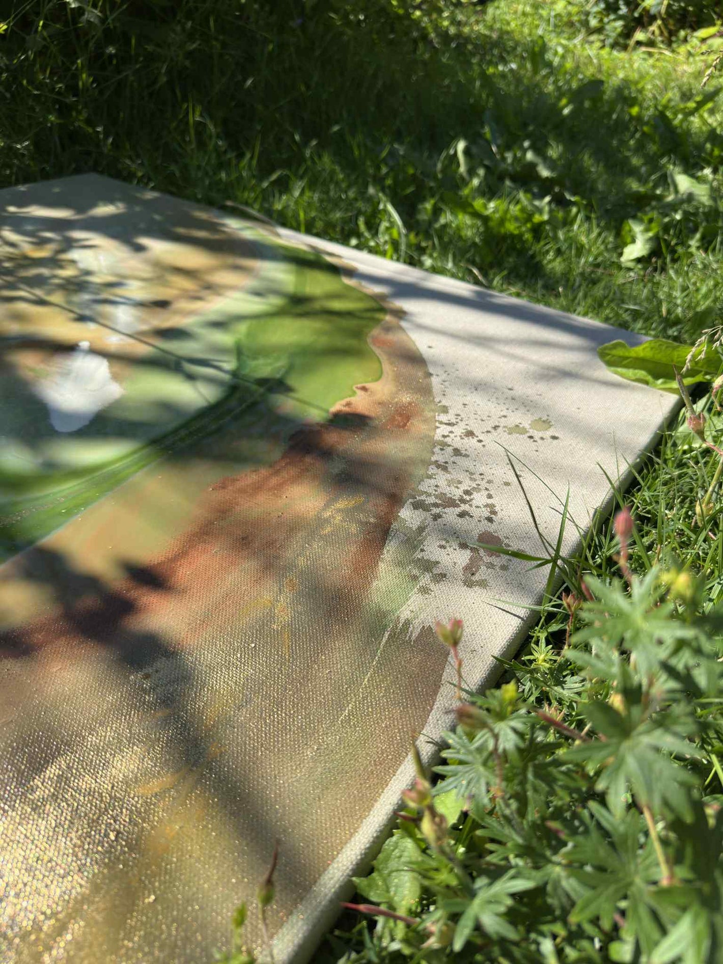 De första lagren uppstår intuitivt och abstrakt. Varje lager får torka innan nästa läggs på, vilket låter färgerna sjunka in och samspela med varandra. När målningen torkat börjar jag söka efter former och motiv som framträder ur färgerna. Utifrån dessa bygger jag vidare med detaljer och naturinslag, inspirerade av både verkliga platser och minnesbilder.
