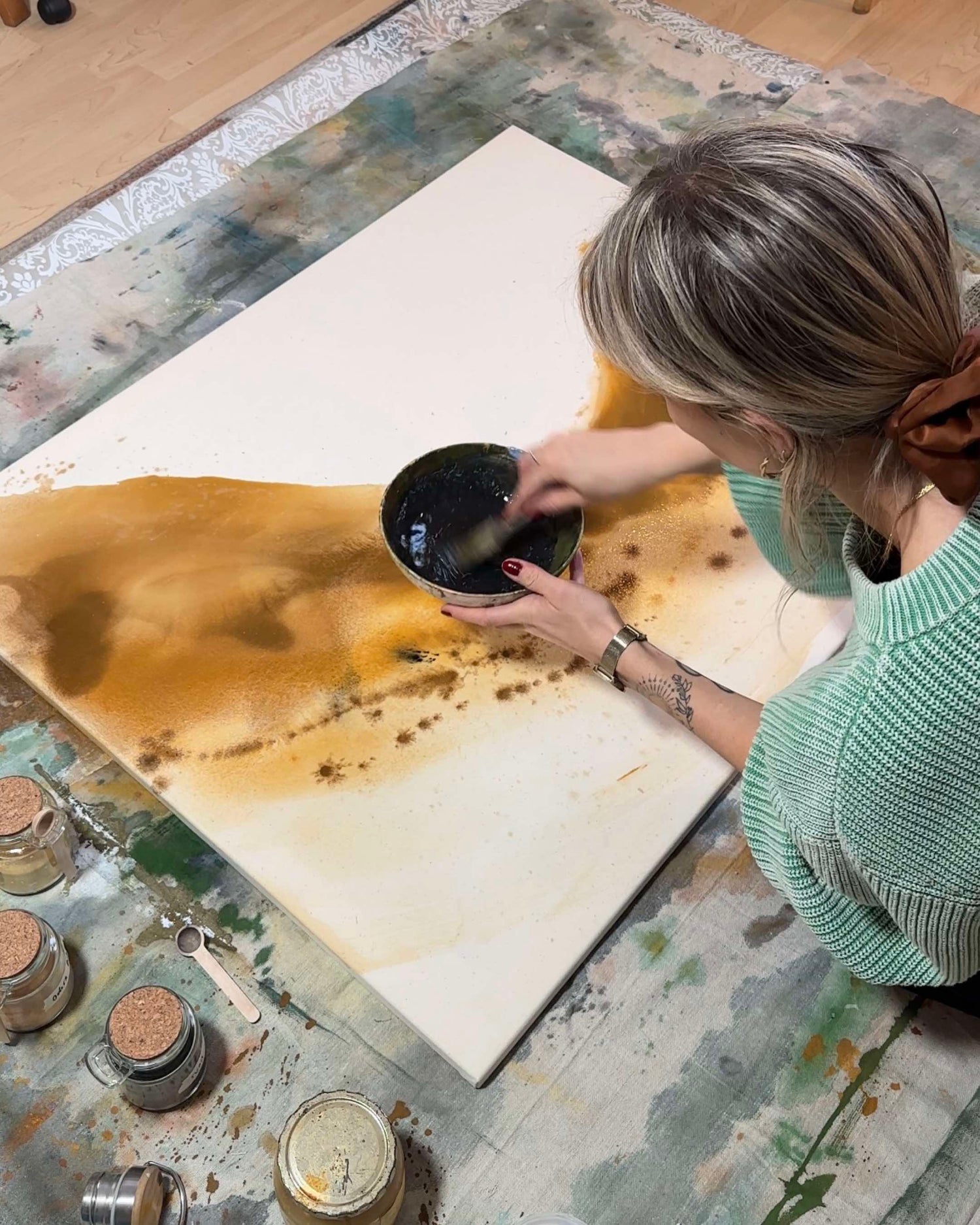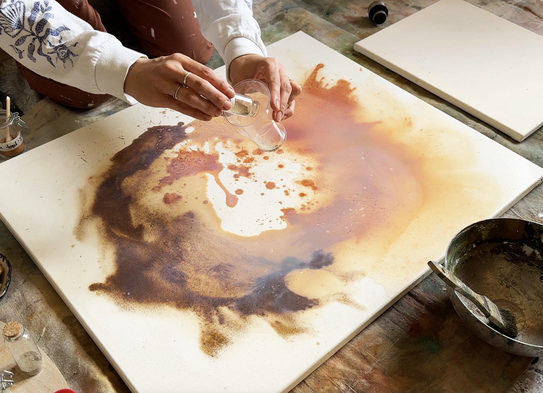 Jag spänner upp mina dukar själv, på bomulls- eller linnetyg, och grundar dem med en transparent primer för att bevara den naturliga ytan. Därefter häller jag ut färgblandningar av jordpigment, bindemedel och vatten över duken. Jag arbetar även med flödande akrylfärger för att skapa kontraster och variation i färg och struktur.